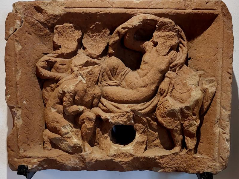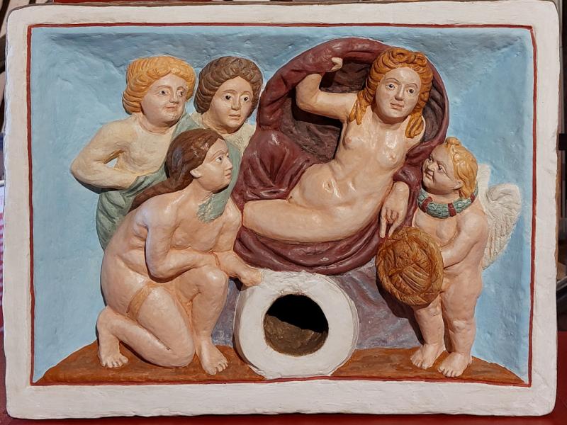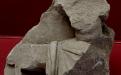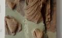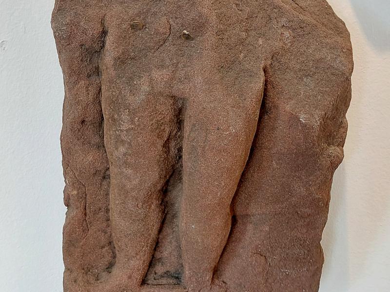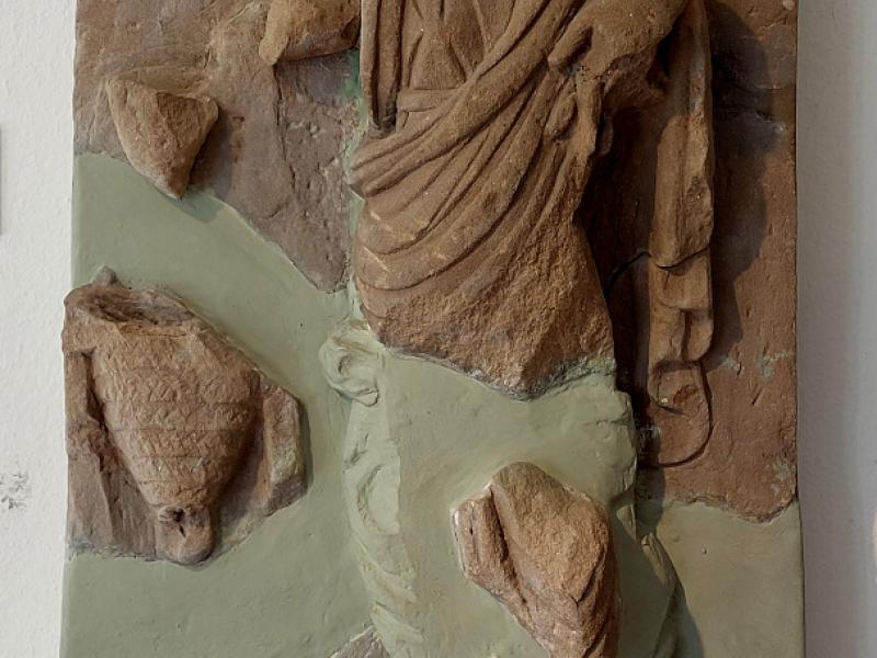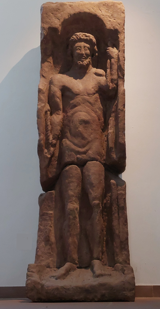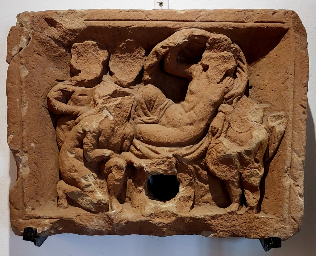 C’est en grande partie grâce à cette interpretatio romana que la religion gallo-romaine a pris un aspect complexe, mais extrêmement savoureux. Ainsi, le relief en grès de la Vénus de Schwarzenacker31, qui semble interpréter un modèle de l’art hellénistique d’une manière un peu rustique, rappelle la proximité du divin dans l’existence de chacun. Ce bas-relief, en effet, faisait vraisemblablement partie d’une fontaine : la conduite d’eau aboutissait à son ouverture circulaire32. Pourtant, le sujet représenté comprend cinq personnages impliqués dans une scène à caractère religieux. Le côté droit est entièrement dominé par Vénus et Cupidon : la déesse, allongée en une sorte d’apothéose, déploie son ample manteau qu’elle tient du bras droit ; en dessous d’elle, son fils, ailé et nu avec un collier de fleurs autour du cou, tient un objet rond, peut-être un panier en osier. Sur la moitié gauche, à côté de la sortie du conduit, une femme est accroupie ; elle est nue et porte un ruban autour de la cuisse droite, sa chevelure lui tombe dans le dos. Elle dirige son regard vers Vénus et Cupidon et tient un objet qui n’est plus reconnaissable. Les deux femmes debout derrière elle sont vêtues et coiffées à la mode romaine.