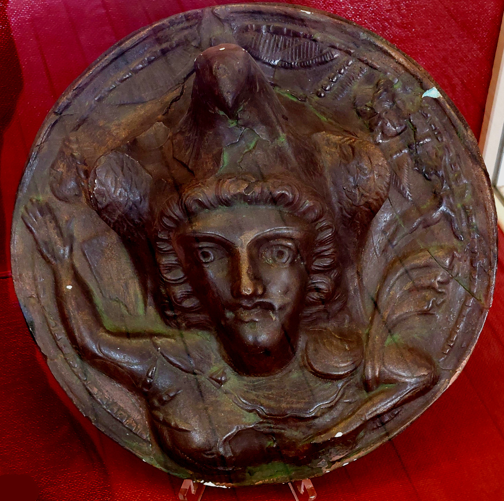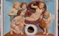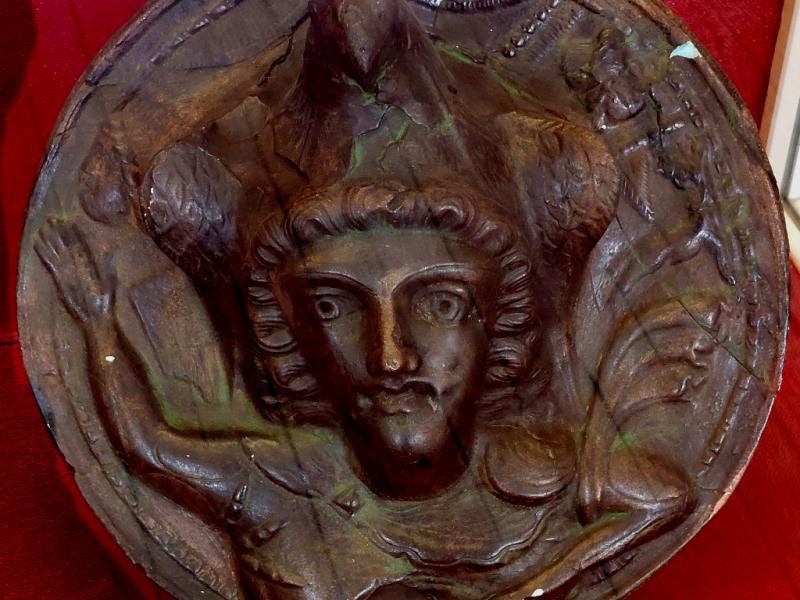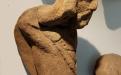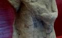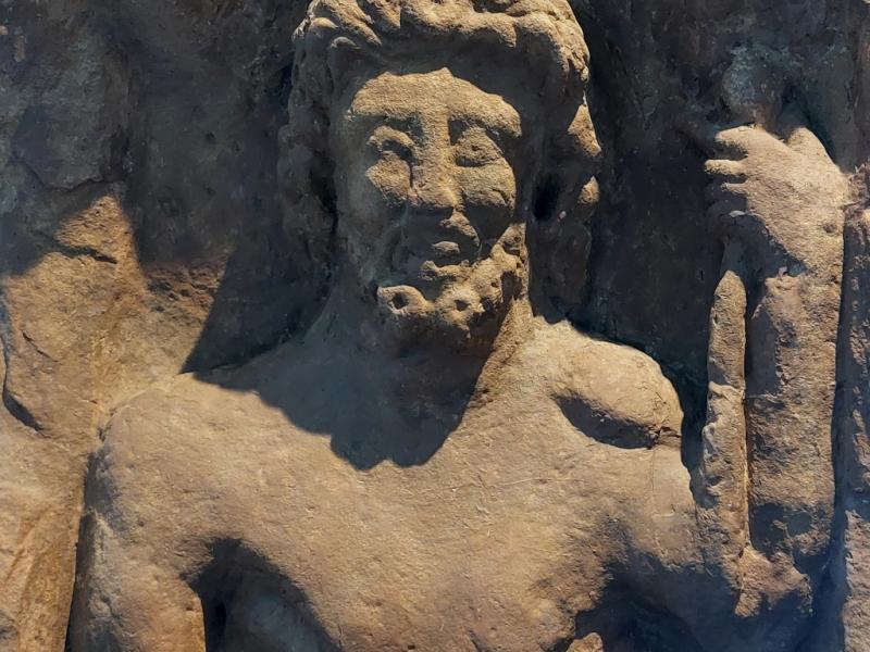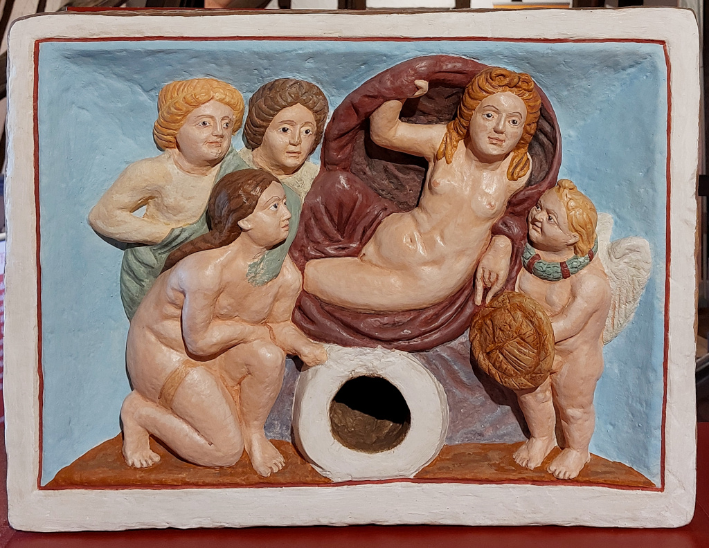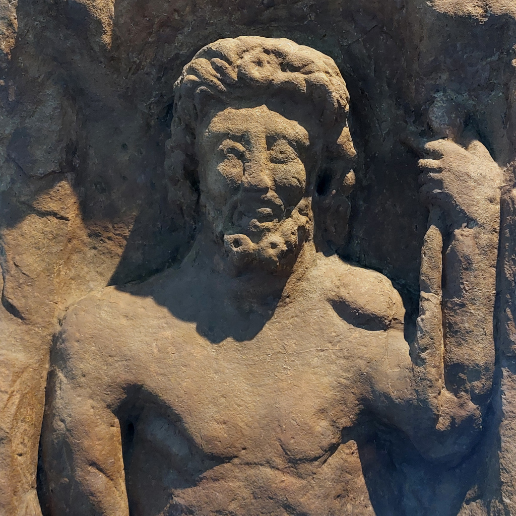 C’est en grande partie grâce à cette interpretatio romana que la religion gallo-romaine a pris un aspect complexe, mais extrêmement savoureux. Ainsi, le relief en grès de la Vénus de Schwarzenacker31, qui semble interpréter un modèle de l’art hellénistique d’une manière un peu rustique, rappelle la proximité du divin dans l’existence de chacun. Ce bas-relief, en effet, faisait vraisemblablement partie d’une fontaine : la conduite d’eau aboutissait à son ouverture circulaire32. Pourtant, le sujet représenté comprend cinq personnages impliqués dans une scène à caractère religieux. Le côté droit est entièrement dominé par Vénus et Cupidon : la déesse, allongée en une sorte d’apothéose, déploie son ample manteau qu’elle tient du bras droit ; en dessous d’elle, son fils, ailé et nu avec un collier de fleurs autour du cou, tient un objet rond, peut-être un panier en osier. Sur la moitié gauche, à côté de la sortie du conduit, une femme est accroupie ; elle est nue et porte un ruban autour de la cuisse droite, sa chevelure lui tombe dans le dos. Elle dirige son regard vers Vénus et Cupidon et tient un objet qui n’est plus reconnaissable. Les deux femmes debout derrière elle sont vêtues et coiffées à la mode romaine.
