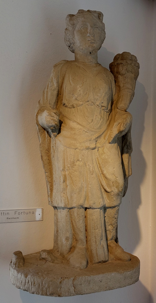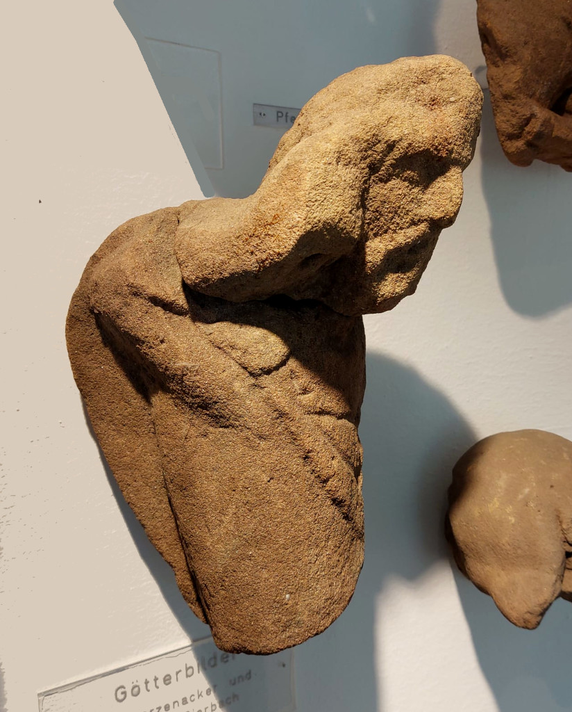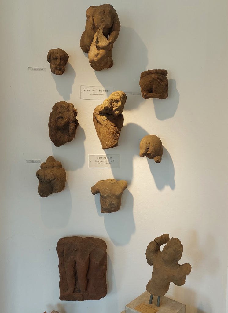 La religion de la société gallo-romaine tient donc beaucoup de la dévotion populaire ; les sanctuaires gardent souvent un aspect provincial. La colonne de Jupiter érigée dans le parc est un bon exemple de cet art autochtone qui adapte l’art gréco-romain à sa façon. Ce caractère se retrouve dans les salles du musée, où sont exposées des statues et des bas-reliefs en grès qui proviennent de la petite ville ou des environs : Jupiter de Lantzkirchen33, Nantosvelta et sculptures de Bierbach, Fortuna de Reinheim, Jupiter trônant, Epona, éléments d’autels votifs ou de colonne de Jupiter…