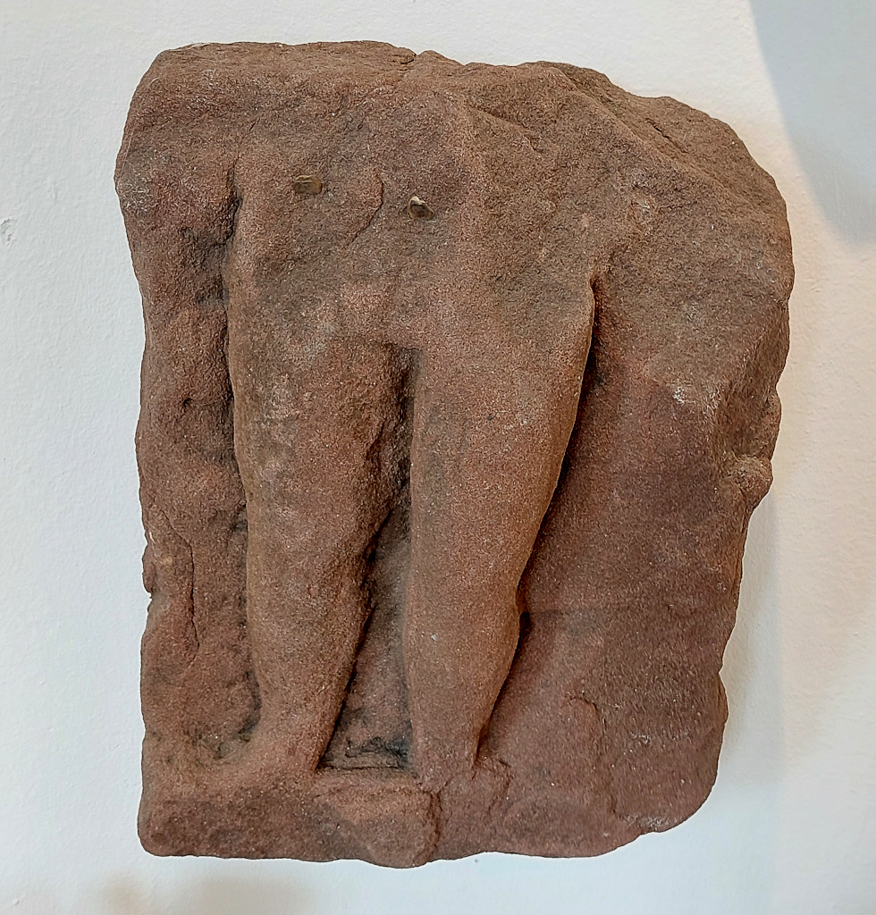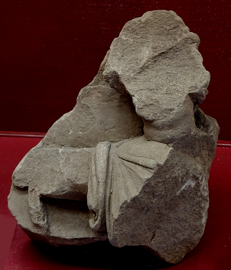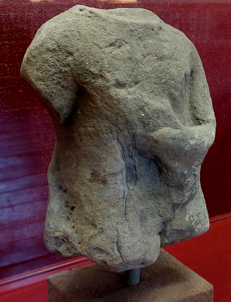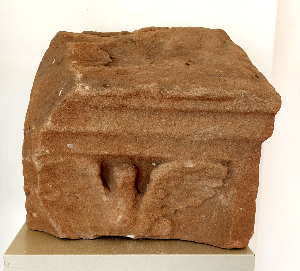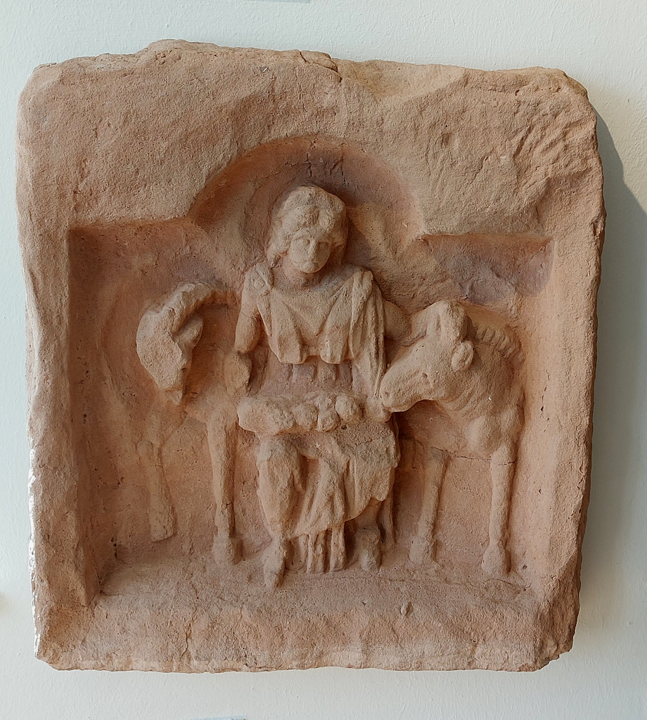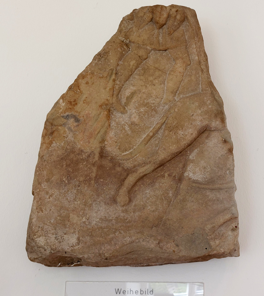 A l’époque romaine, la religion était intimement mêlée à la vie des gens. Bien que les prospections archéologiques n’aient pas encore mis au jour une aire qui soit réservée à ce domaine, la population de Schwarzenacker, comme toute la région, avait adopté le panthéon romain, voire même certaines croyances orientales qui envahissaient peu à peu l’Empire. Le vieux fonds celtique n’avait pour autant pas entièrement disparu. En s’assimilant aux dieux romains, les divinités celtes leur apportaient aussi quelques-unes de leurs qualités. D’autres subsistèrent sous leur propre nom car elles n’avaient pas d’équivalent dans la religion romaine. Ainsi Epona, dont la dévotion touche toute la Gaule. Schwarzenacker en a livré une belle représentation30, ce qui ne saurait surprendre dans un relais routier. La déesse est figurée en bas-relief au sommet d’une stèle grossièrement travaillée à la gradine : elle est assise, de face, avec un cheval de part et d’autre, et tient une corbeille de fruits sur les genoux. Cette iconographie peu commune correspond bien cependant à une divinité à la fois protectrice des voyages et garante de la prospérité.