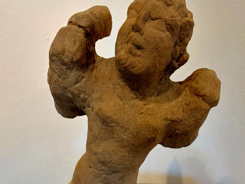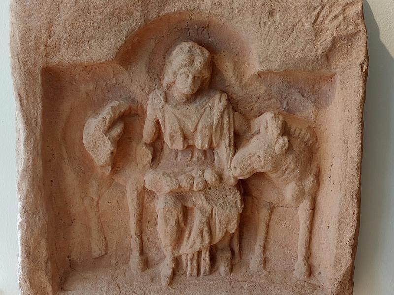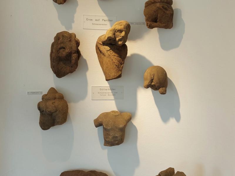 D’autres figurines, en terre cuite, sont le produit d’un artisanat très actif qui les a répandues dans toute la Gaule romaine. Réalisées au moule en grande série, elles ont parfois un aspect un peu fruste, ce qui importait peu car elles répondaient peut-être à des sentiments plus personnels ou servaient d’offrande funéraire. Le monde des morts n’est guère présent au musée de Schwarzenacker, sans doute parce que la nécropole n’a pas encore été explorée. Certains monuments y sont vraisemblablement associés par le symbolisme qu’ils traduisent, comme la pomme de pin et une stèle représentant un voyage en voiture. La stèle-maison, quant à elle, est assurément une spécificité funéraire des Médiomatriques.